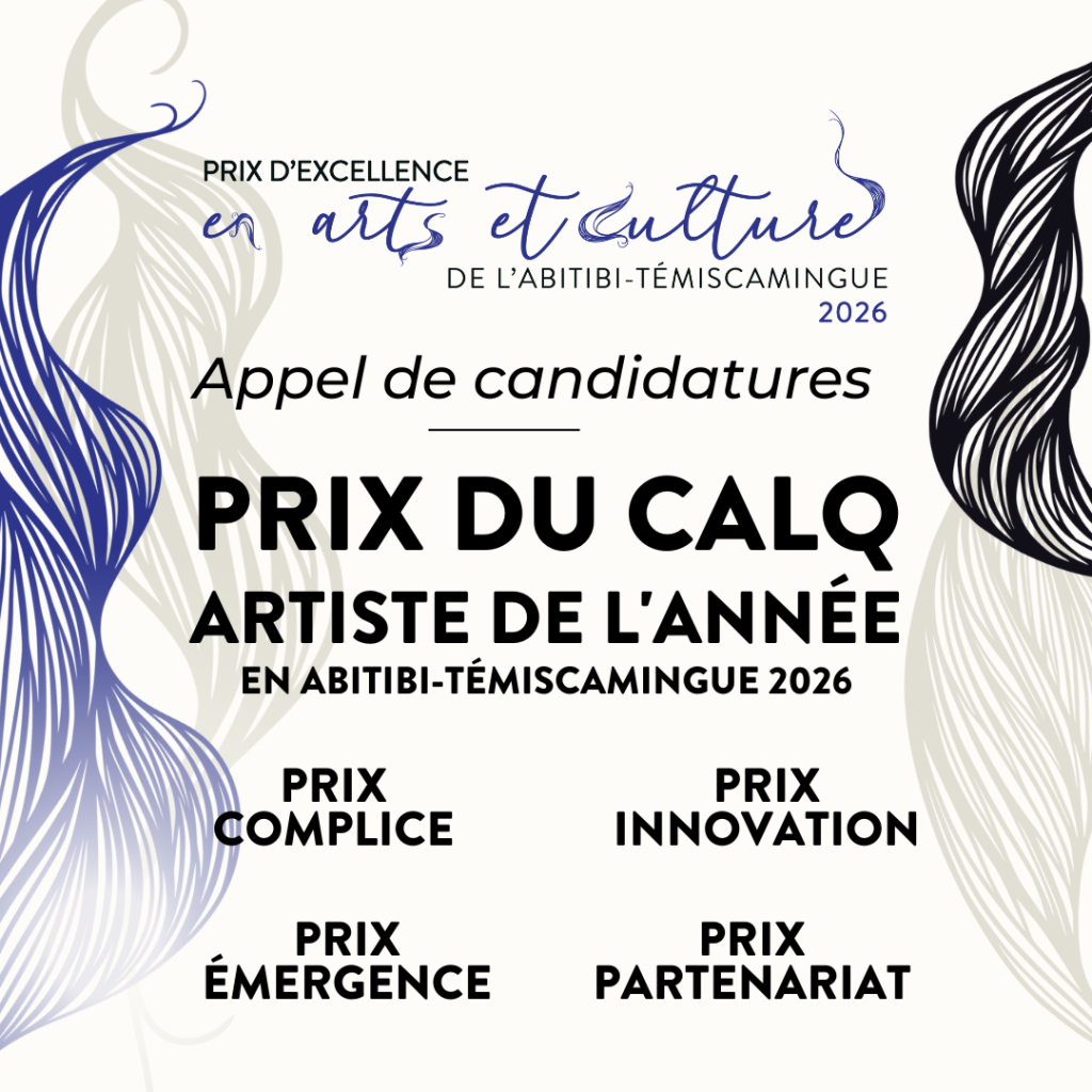 Abitibi-Témiscamingue, le 2 décembre 2025 – Le Conseil des arts et des lettres du Québec (CALQ), en collaboration avec le Conseil de la culture de l’Abitibi-Témiscamingue (CCAT), lance un appel de candidatures pour le Prix du CALQ – Artiste de l’année en Abitibi-Témiscamingue 2026.