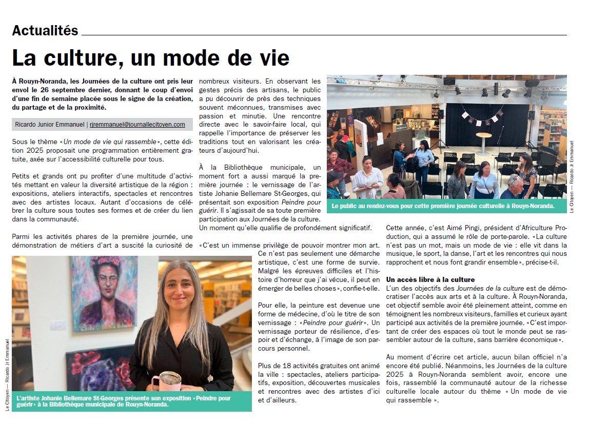 -À venir (septembre 2025) : Exposition d’un mois dans le cadre de la programmation des Journées de la culture 2025 à Rouyn-Noranda.