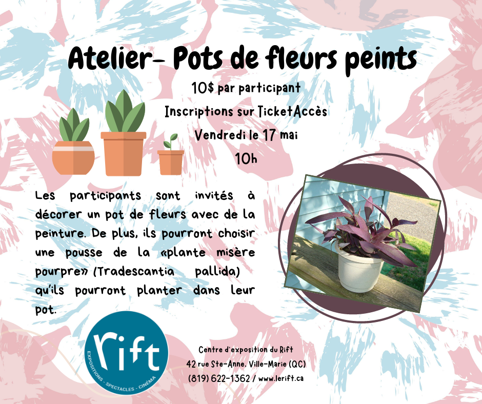 Les participants sont invités à décorer un pot de fleurs avec de la peinture. De plus, ils pourront choisir une pousse de la «plante misère pourpre» (Tradescantia pallida) qu’ils pourront planter dans leur pot.