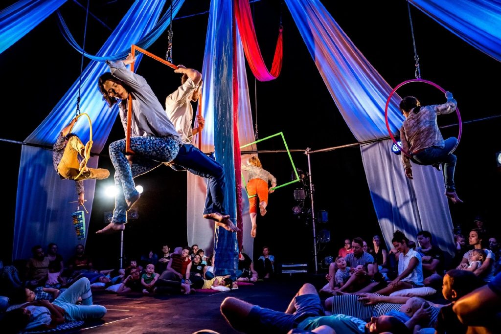 Le Mobile est une expérience immersive de spectacle vivant pour nourrissons, mêlant cirque, conte, chant et musique. Inspiré du mobile pour bébé, l’univers prend vie à travers les corps en mouvement, les jeux de lumière et les ombres des chorégraphies aériennes.