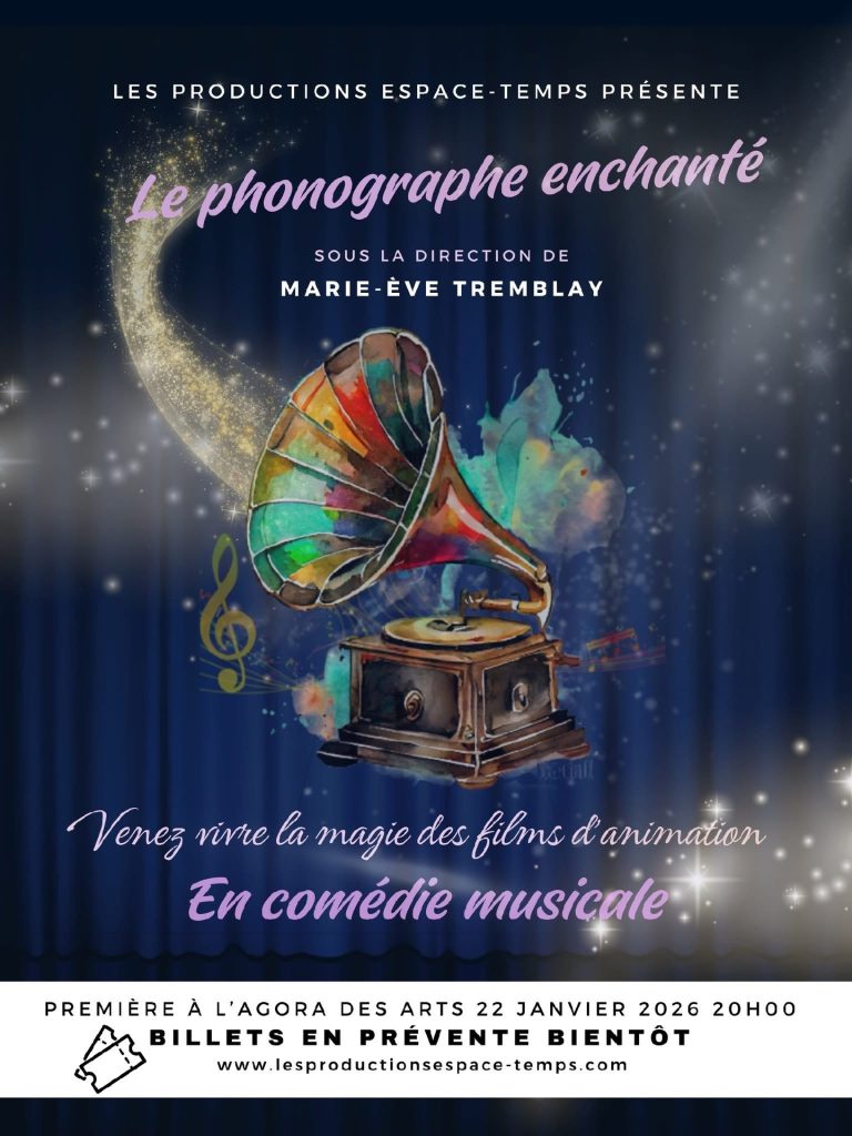 Découvrez notre comédie musicale envoûtante qui célèbre les films d’animation emblématiques de 1930 à aujourd’hui ! Une ligne du temps brisée menace l’existence de nos histoires préférées. Rejoignez nos personnages, guidés par « Le phonographe enchanté », dans une aventure palpitante pour rétablir l’équilibre. Vivez la nostalgie et la magie des numéros musicaux inoubliables. Ne manquez pas cette expérience unique ! Réservez vos billets dès maintenant !